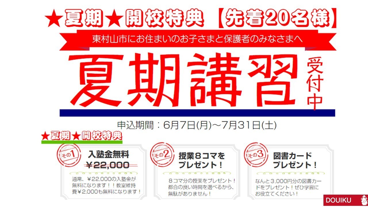 DOUIKU~導育塾~【東村山】数学・英語の専門性が高く、一人ひとりに向き合う進学塾。授業スタイルは、完全1対1の個別指導。導育塾では、夏期開校3大特典として、①入塾金無料、②授業8コマプレゼント、③3000円分の図書カードプレゼント、をしています。是非、導育塾の授業を体験してみて下さい!!