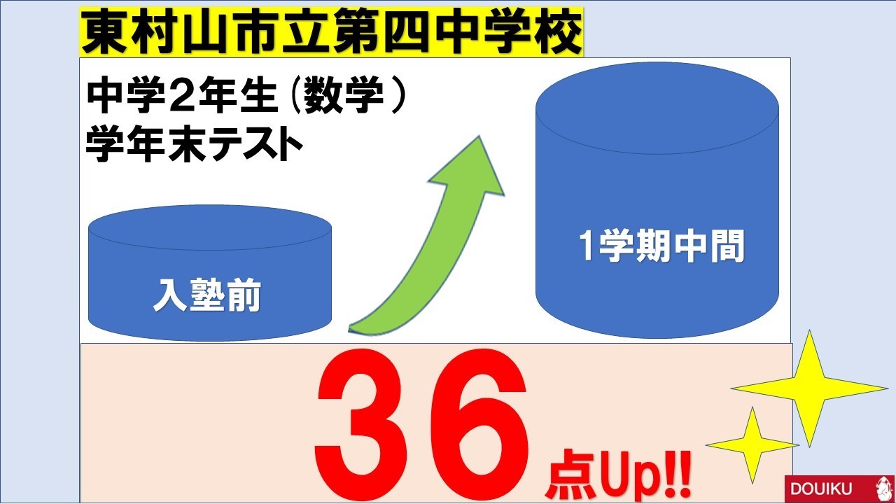■5/22(月)圧倒的な成績向上!東村山四中2年生が数学で過去最高得点を獲得!導育塾【東村山】数学・英語の専門性が高く、一人ひとりに向き合う進学塾。またまた、やってくれました!!、東村山四中の2年生が数学で過去最高得点を獲得し、圧倒的な成績向上を実現してくれました!!!なんと、「61点」の点数UPです!!本当に素晴らしい結果です!!おめでとう!!!