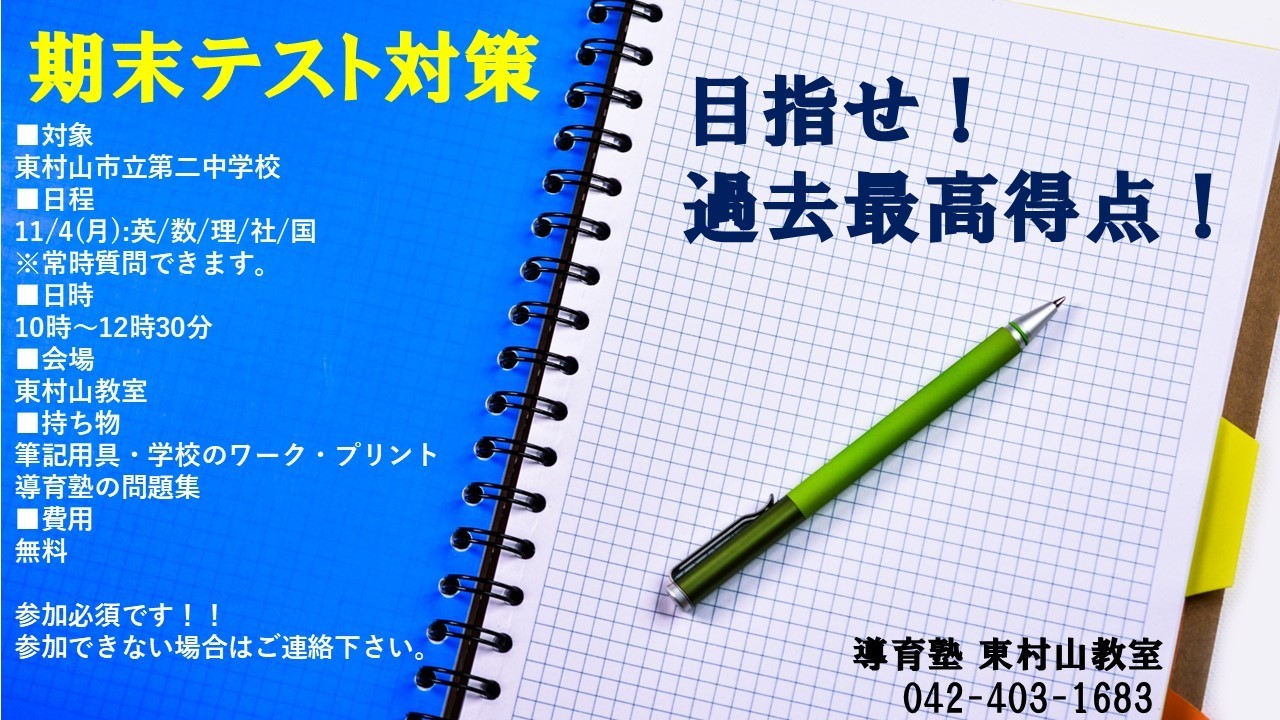 ■10/31(木)やります!、東村山二中の期末テスト対策!!導育塾【東村山】数学・英語の専門性が高く、一人ひとりに向き合う進学塾。導育塾 東村山教室、やります!!、東村山二中を対象とした期末テスト対策を実施し!!、「目指せ、過去最高得点」!!