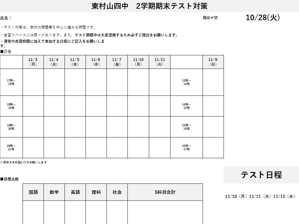 ■10/27(月)やります!東村山二中の期末テスト対策!!導育塾【東村山】数学・英語の専門性が高く、一人ひとりに向き合りに向き合う進学塾、導育塾東村山教室、やります!!、東村山二中の期末テスト対策!!