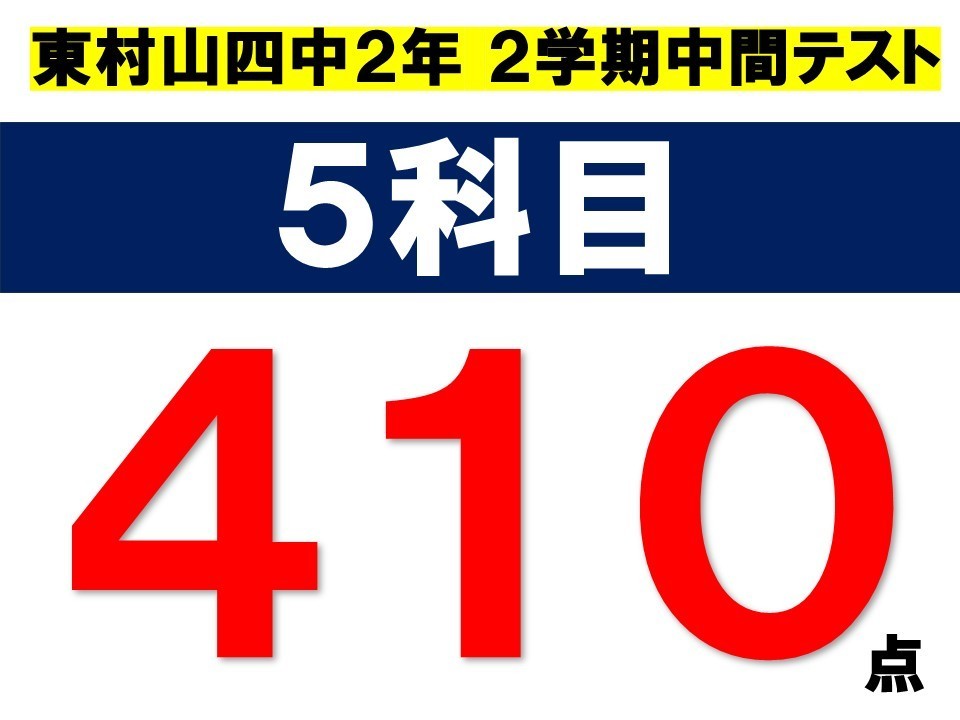 ■10/1(水)東村山四中2年生「5科目合計:410点獲得」!!導育塾【東村山】数学・英語の専門性が高く、一人ひとりに向き合りに向き合う進学塾、すばらしい!!、東村山四中2年生、5科目の合計410点!!!、よく頑張りました!!