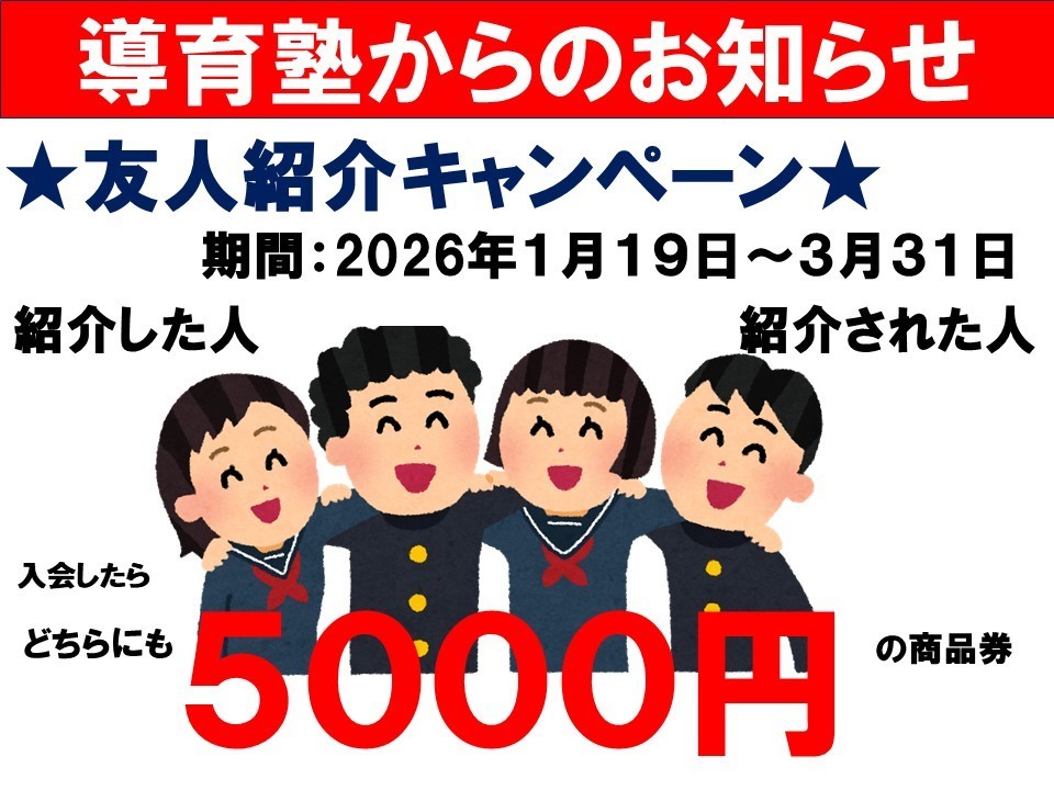 ■2/7(土)★友人紹介キャンペーン★!!導育塾【東村山】数学・英語の専門性が高く、一人ひとりに向き合りに向き合う進学塾、導育塾 東村山教室、★友人紹介キャンペーン★のご案内です!!、紹介した人、紹介された人、どちらもに紹介特典がございます!!、現状の成績に満足できず、成績向上を実現したい方をお待ちしております!!